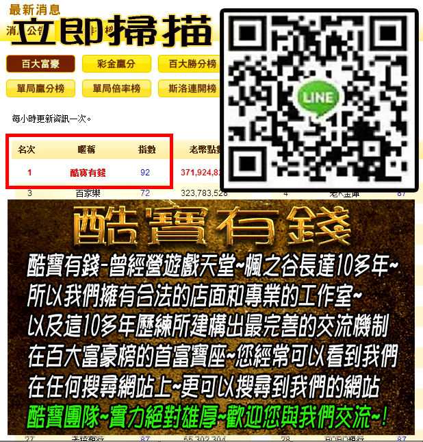 酷寶有錢-23年網路遊戲經營~絕對深得您信賴~! 酷寶有錢-絕對24H-頻道1隨時為您服務~! 酷寶從早期的(天堂)約10年,一直到現在的老子有錢, 超過13年以上的網路遊戲交流,經營理念始終不變~! <========請點擊左邊的 閱讀更多 ~就會出現此篇文章了喔~! 或是點擊上面的最大標題也可以進入此文章